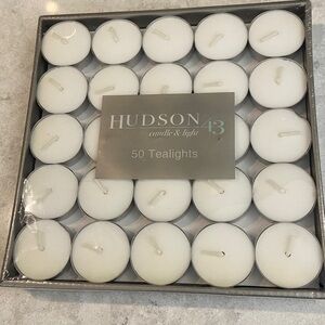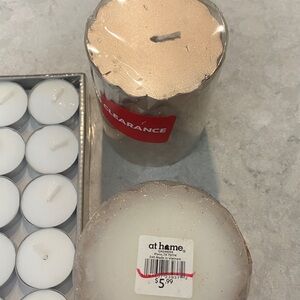 Elegant rose gold/metallic candles (2) from At Home, and 50 count white tealights by Hudson 43. All are unscented, in original packaging and have not been used/not lit.