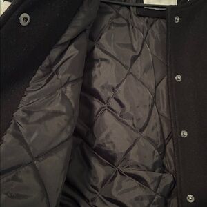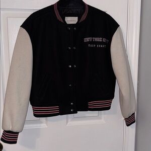 A laid-back jacket with collegiate vibes and a shoutout to the Big Apple on the front and back. Woven fabric, Snap placket, Contrast-color sleeves, Angled welt front pockets, Relaxed fit, Low-cut striped knit collar, Striped knit cuffs & hem.