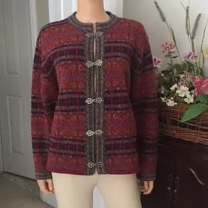 Cambridge dry goods wool Nordic sweater, size M, front closure 5 pewter hooks, unlined, see photo’s for detailing, excellent condition,