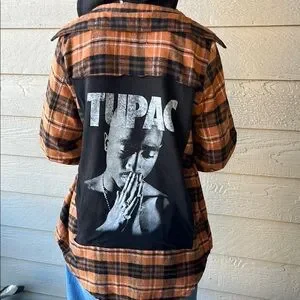 Tupac Shakur Upcycled Flannel Shirt with Hood Size Medium M Handmade
