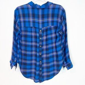 Anthropologie blue pink black plaid Henley neckline long sleeve popover blouse. ISADORA button back tunic blouse.