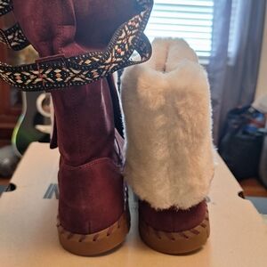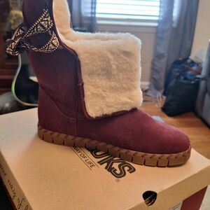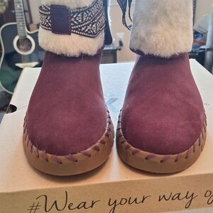 Stay cozy and stylish with these burgundy fur-lined boots. Perfect for chilly days. New Muk Luks in the color Bordeaux. size 9