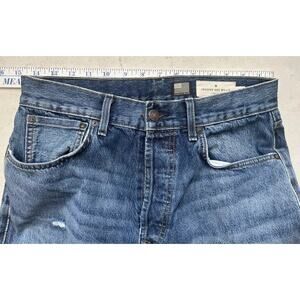 These felt snug for a size 29, and wore them when I was size 28 in Levi’s. I’m unsure if that’s just how this brand runs normally or not. The jeans have been hemmed to 27”, but will obviously be a bit shorter if you’re showing off that selvedge edge. Light distressing throughout, giving them a lived-in go-to favorite pair about them, which they will be :)