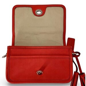 The exterior is made fully of leather in a beautiful poppy red, with a nickel turn-lock closure, a beautiful tassel, detachable double strap and Vintage Remake Hang Tag.