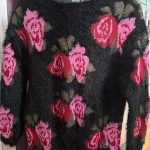 Super soft !!! size Medium … Chic black sweater with bold pink floral pattern. Soft and cozy texture. Perfect for stylish layering.