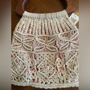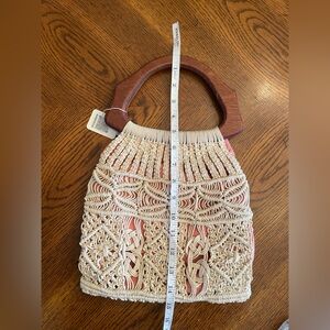 Complete your boho look with this cute crochet handbag with wooden handles. Complete lined on the inside with a pink canvas material.