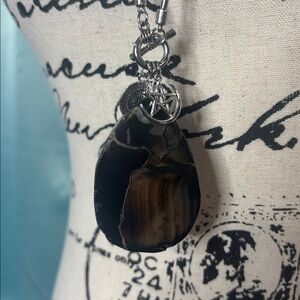 Here I have made for you a lovely tear drop shaped black agate slice suspended from a gorgeous toggle chain. The chain is very strong and fluid- vintage estate piece in like new condition. I added two Moon and Star Charms for a little extra flair. I use black agate in grounding meditation. This one has nice natural color variation and inclusions. I use vintage elements for their charm and sustainability. Very corporate goth, very Child of Nature.