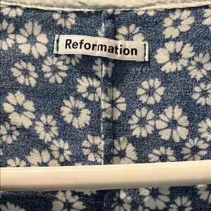 Super cute, super stylish blue blouse with white floral pattern by Reformation. Long sleeves and button-down front with matching buttons.