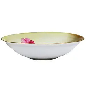 This elegant porcelain serving bowl features a hand-painted rose motif in shades of pink and magenta, set against a soft green wash with a rim finished in gold. Measuring approximately 9¼ inches in diameter, the bowl reflects the refined aesthetic of early 20th-century German porcelain.