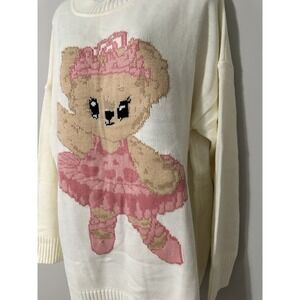 cuz hug me tight. This sweater has a knit construction, long sleeves, a crew neckline, with a ballerina teddy design on the front.
