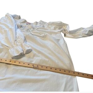 Step into timeless elegance with this vintage La Lingerie cotton nightgown, a romantic cottagecore sleepwear piece that blends comfort and beauty. Made from 100 percent soft cotton, this prairie-style nightdress features a delicate embroidered and ruffled V neckline with a tie closure and long puff sleeves finished with ruffled cuffs.