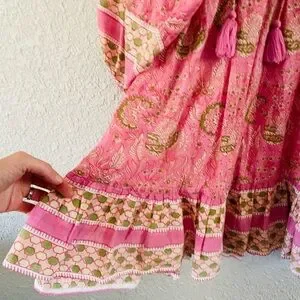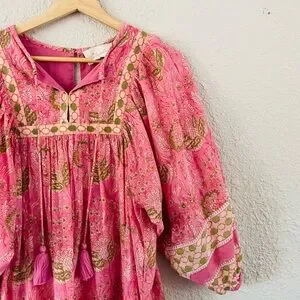 Elegant mini dress with vibrant pink and gold patterns. Features flowing sleeves and intricate detailing. Perfect for stylish outings. Worn once. GUC, just some slight wear on the tassels. Smoke free home and fast shipper.