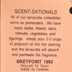 Terracotta collectible that serves as a pomander. Simply pour 2-3 drops of potpourri oil into the opening and the terracotta will absorb and permeate the fragrance.