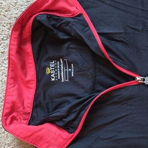 Kastel quarter-zip pullover in black with a striking red collar and mesh underarms. Size small.