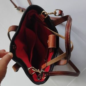 Chic black leather tote with tan accents. Features sturdy handles and adjustable strap. Ideal for everyday use. There are a few marks inside the bag, otherwise the bag is in great, gently used condition. Leather has been cleaned and conditioned. Beautiful, classic, timeless purse.