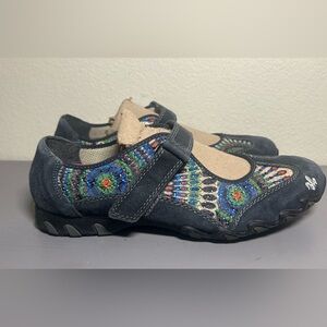 Chic Rieker sneakers featuring colorful embroidery and an easy hook-and-loop strap closure. Crafted with durable stitchdown construction for lasting flexibility and comfort. The lightweight sole offers shock absorption and support with every step, while the extra-soft MemoSoft insole ensures all-day comfort. Some wear consistent with suede and light cracking on straps — see pictures for details. Perfect for casual, everyday style with a touch of flair.