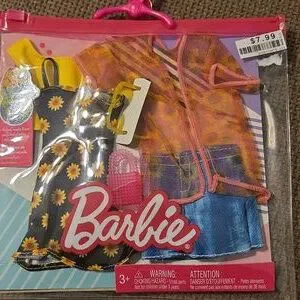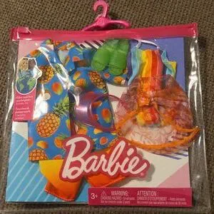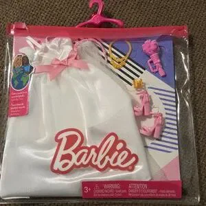 This is a set of 3 Barbie outfits. each are New in package. Included are a wedding dress with jewelry, shoes, and bouquet. Also a summer 2 pack with a sundress and short and tshirt outfit with a purse and glasses. Final set is a Barbie and Ken swimsuit set with slides and visor. Super cute clothes for your Barbie fan