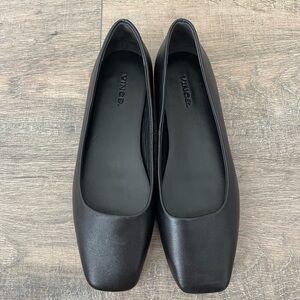 Timeless black leather loafers by Vince. Features a modern square toe. Ideal for versatile styling.