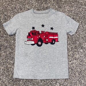 Comfy gray T-shirt with a bright red firetruck. Great preloved condition.