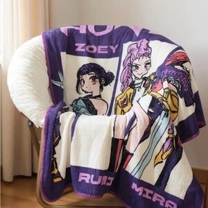Bring the exciting world of KPOP to life with this Huntrix Throw Blanket featuring characters Zoey, Rumi, and Mira. Perfect for any KPOP or anime fan, this soft polyester blanket in purple and pink offers warmth and style. Measuring 46" x 60", it's great for Twin/Full beds, gaming chairs, or lounging. Easy to clean and maintain, this blanket is machine washable, ensuring it stays fresh and comfortable for every use.