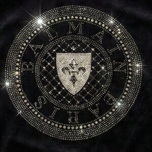 Style Tags: Designer Luxury Parisian Streetwear Velour Crewneck Jumper Sweatshirt Rhinestone Crystal Embellished Logo Glam Sparkle Evening Statement (Balmain Paris)