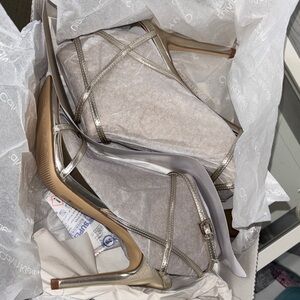 Chic metallic gold sandals with strappy design. Ideal for elegant outings. Brand new never worn originally bought for prom in 3 sizes. Incredibly comfortable and cute!