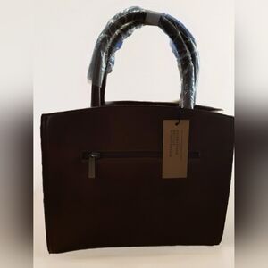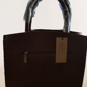 Stylish brown handbag with a sleek design. Features a front zipper pocket and sturdy handles.