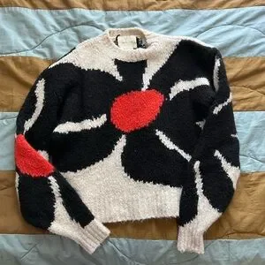 Stylish crew neck sweater. Features bold black and cream design with red accents. Perfect for casual wear.