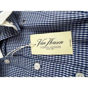 Classic Van Heusen Fitted men’s button-down shirt in a clean blue gingham check pattern. Lightweight, crisp, and great for office, business casual, or everyday wear. Brand-new with tags attached. No flaws noted.