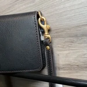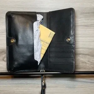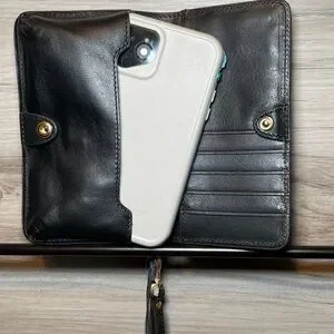 Snap closure, removable wristlet strap with brushed gold tone hardware, 5 card slots, 2 bills/receipts slots, phone pocket (actual phone pocket measurement approx 6.25 inches long, 1" deep- shown with an iPhone 11 with Lifeproof full case, for reference)