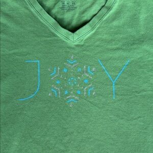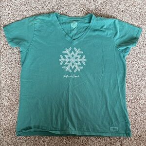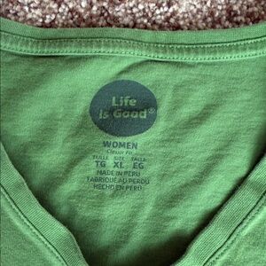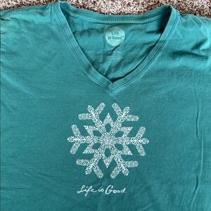 Life Is Good shirts, one green short sleeve V-neck with a white snowflake design, the other green long sleeve with ‘JOY’ graphic. Both Women’s XL. Smoke free home.