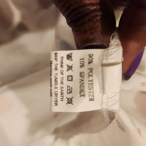 Splatter colored blouse. White background with green, purple, & orange. High waisted suits on each side. Button down front. Quarter length sleeves. Size small. Measurements attached. 90% Polyester & 10% Spandex. Measurements attached.