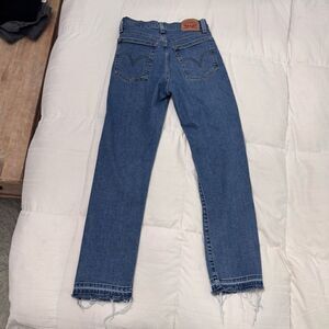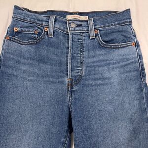 Levi’s “Wedgie Straight” Blue Jeans with raw hemline & button fly, 26- like new!