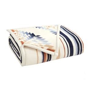Brand new with tags and in original retail packaging, this Pendleton Reversible Plush Throw Blanket features the classic Savanna Stripe design. The striped face showcases Pendleton’s signature color palette of ivory, navy, tan, and warm earth tones, while the reverse offers a coordinating geometric pattern for versatile styling.