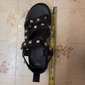 Chic black sandals by Maje. Adorned with gold studs. Perfect for a bold look.