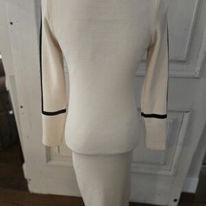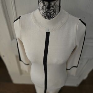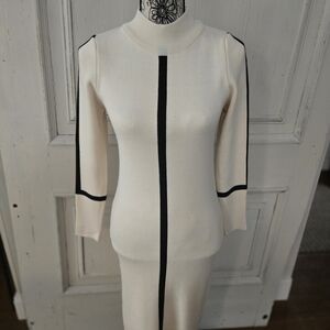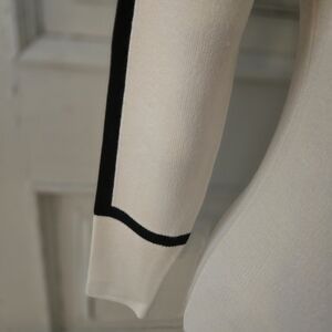 This elegant cream dress features striking black accents and a sleek design, perfect for any occasion. Its sophisticated style is both timeless and versatile.