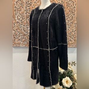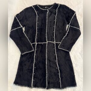 EUC: Absolutely classy and clean, excellent condition! This long cardigan is warm, perfect for cold weather with the fuzzy black knit material, super soft and comfy, NOT itchy at all! This classy yet edgy design has white stitching and metal studded accents. No issues! See pics for measurements & detail P2P 20” flat