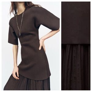NWT. Zara Chocolate/Brown Pleated Combination Knit Midi Dress with round neck and short sleeves. Pleated fabric detail at hem. Back hidden in-seam zip closure. 53% polyester. 25% polyamide. 75% viscose. Size M. Ref. 4192/001. Pit to pit 14,5" flat, sleeves 15,5" from neckline, waist 13", length 55".