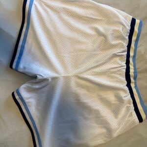 White and black athletic shorts featuring blue and black stripes. Comfortable and stylish for sports or casual wear.