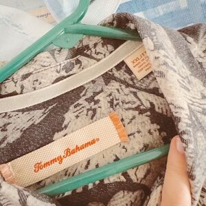 Stylish Tommy Bahama shirt with a gray and cream pattern. Comfortable and elegant design. In perfect condition with no flaws, rips or tears! comment if you have any further questions! ( Any flaws will be pictured )