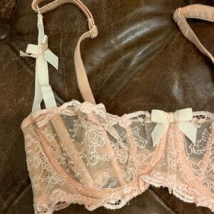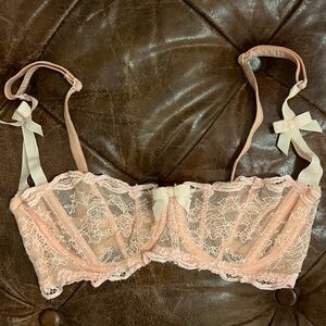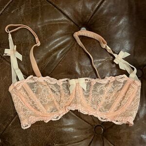 Elegant playful sensual vintage Agent Provocateur peach love bra 32D. Very good condition. Sultry lace adorned with cute bows. This is your chance to own a sought after rare and stunning collectors piece from Agent Provocateur.