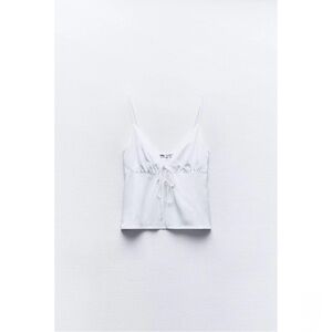 V-neck top with adjustable spaghetti straps. Front openings and ties closure.