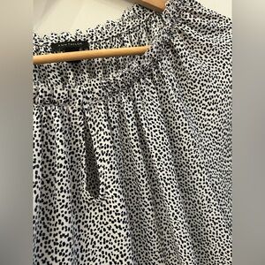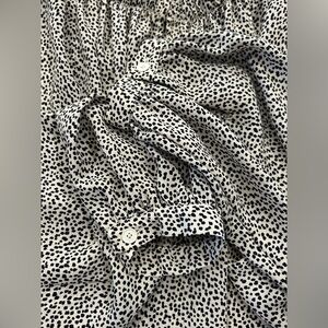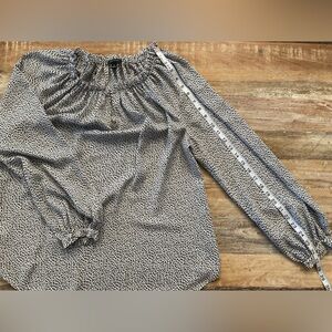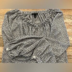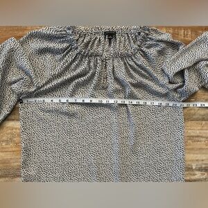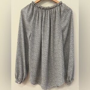 Ann Taylor blouse with a monochromatic, speckled pattern. Features a lovely gathered neckline, key hole and long, buttoned sleeves. Very lightweight - airy, comfortable fit.