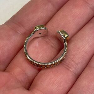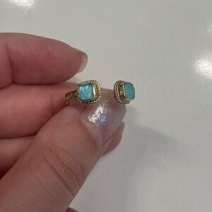 Beautiful Anna Beck handcrafted ring featuring two Turquoise-colored stones set on an open gold-tone band. Known for its artisan craftsmanship and timeless style, this piece makes a unique and elegant statement.
