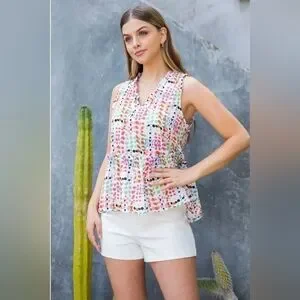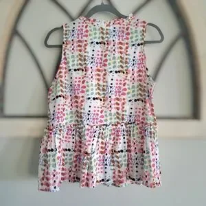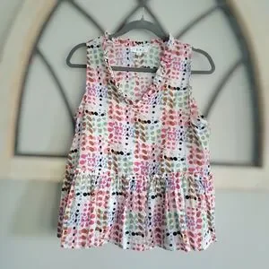 The THML Samantha Multi Color Dot Print Peplum Top in size Small is a stylish and lightweight blouse perfect for summer, fall, and spring. Featuring a polka dot pattern and ruffle accents, this sleeveless top has a flattering V-neckline and wide straps. Made from a rayon and cotton blend, this breathable top is a versatile piece suitable for travel and casual occasions. The pullover closure and regular fit make it easy to wear and comfortable for everyday wear.