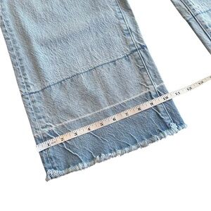 Habitual Wide Leg Raw Hem Light Wash Blue Ankle Jeans. Waist-15.25” Hips-19.25”, x Rise High, Inseam 27.5”. Leg Opening Width 10.5”. Color block on leg bottoms. Pre-owned no stains, no pulls, like new condition. 98% Cotton, 1% Spandex, 1% other. Model pic is AI generated.
