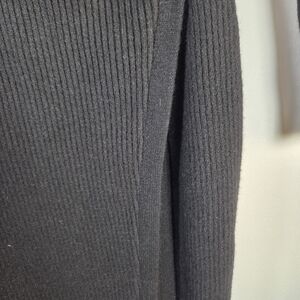 Elegant black long sleeve sweater dress with side slit. Perfect for layering over jeans.