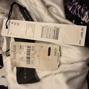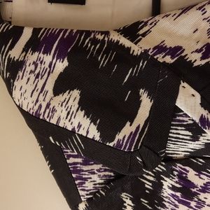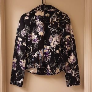 NWT, beautiful size 2 or 8, black, purple, and white floral. Notched lapel, fitted stitched vertical pleats in front and back. Black snap front, fully lined.