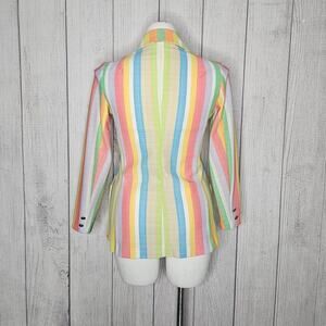 Bold and playful, this vintage 1970s rainbow striped blazer is ready for both the boardroom and the big top. Made from textured pastel lawn-chair–style fabric, it features wide lapels, a tailored longline cut, three silver-tone buttons, and patch pockets. The candy-colored vertical stripes make it perfect for standout looks — think corporate clown, circus ringleader, candy man, or over-the-top disco CEO.