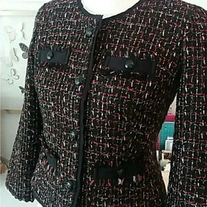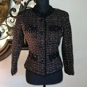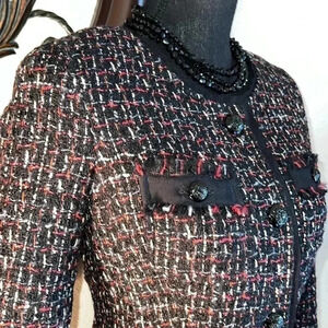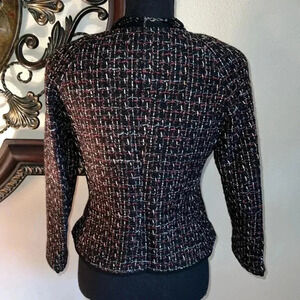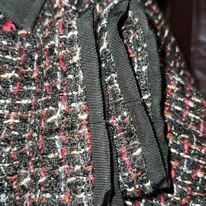 Talbots black, light gray, yellow, red and black tweed blazer with fringe. 4 outside pockets with signature buttons, lined in EXCELLENT condition! No holes or stains. Size: 6P **2 models are wearing a similar blazer**